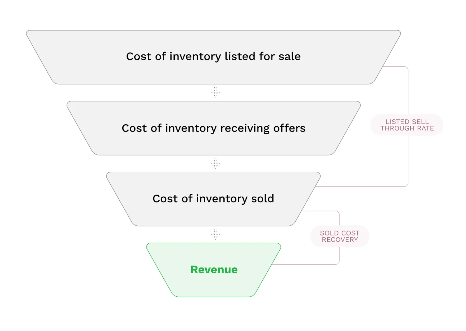 Revenue is the total income generated from all discounted or secondary inventory sales. It reflects the combined effect of sell‑through rate and sold cost recovery.
