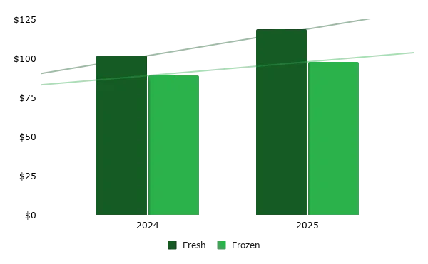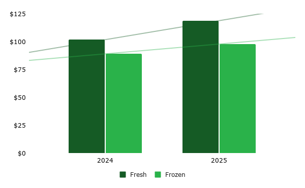 That tracks with the urgency dynamic: fresh gets moved because it has to, and suppliers have built the muscle for it. Frozen, despite growing demand, is still catching up on the recovery side.